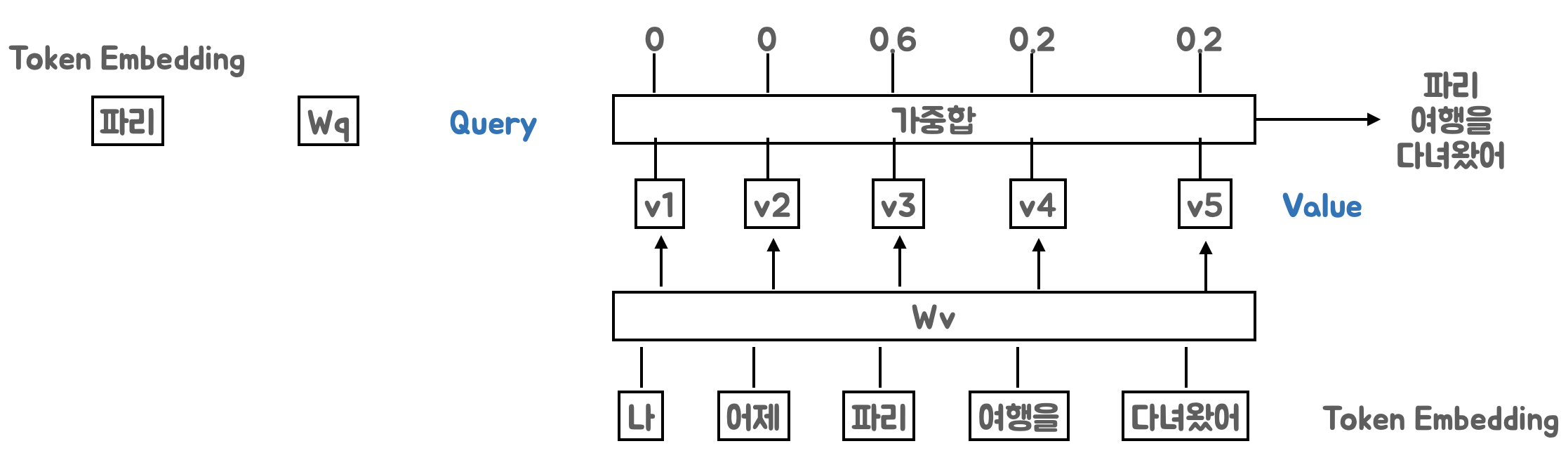 Transformer에서는 값(Value)도 Token Embedding을 가중치(Wv)를 통해 변환