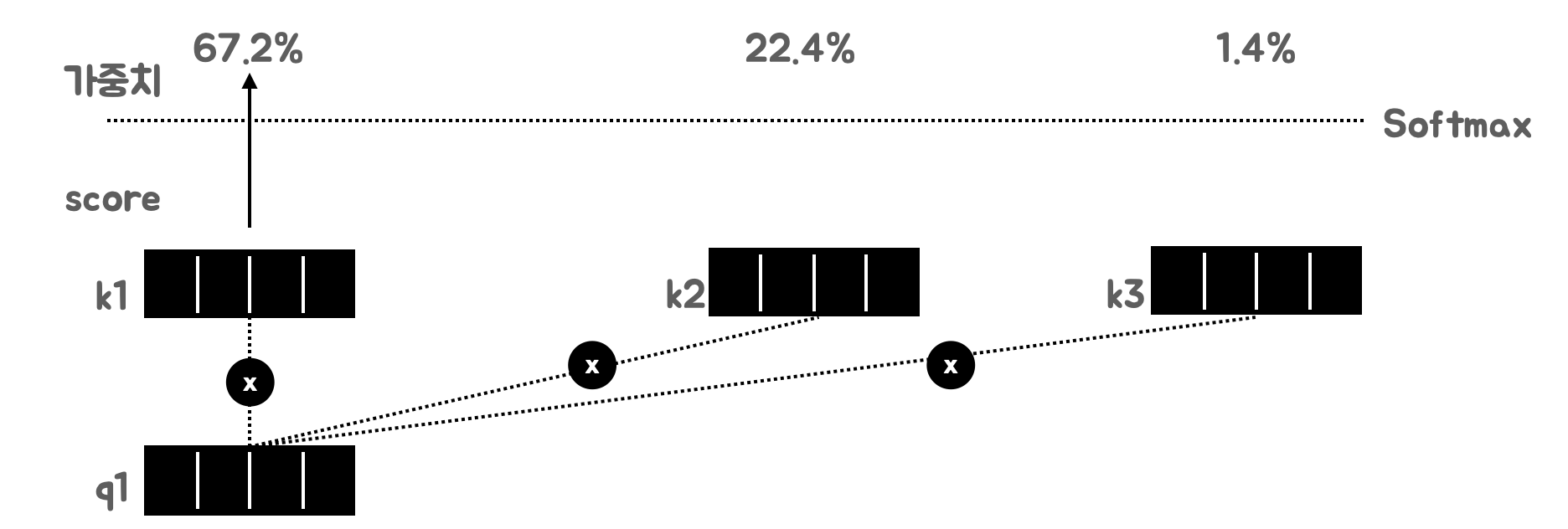 2. Query와 Key를 곱해 계산한 score를 합이 1이 되도록 Softmax를 취해 가중치로 변환