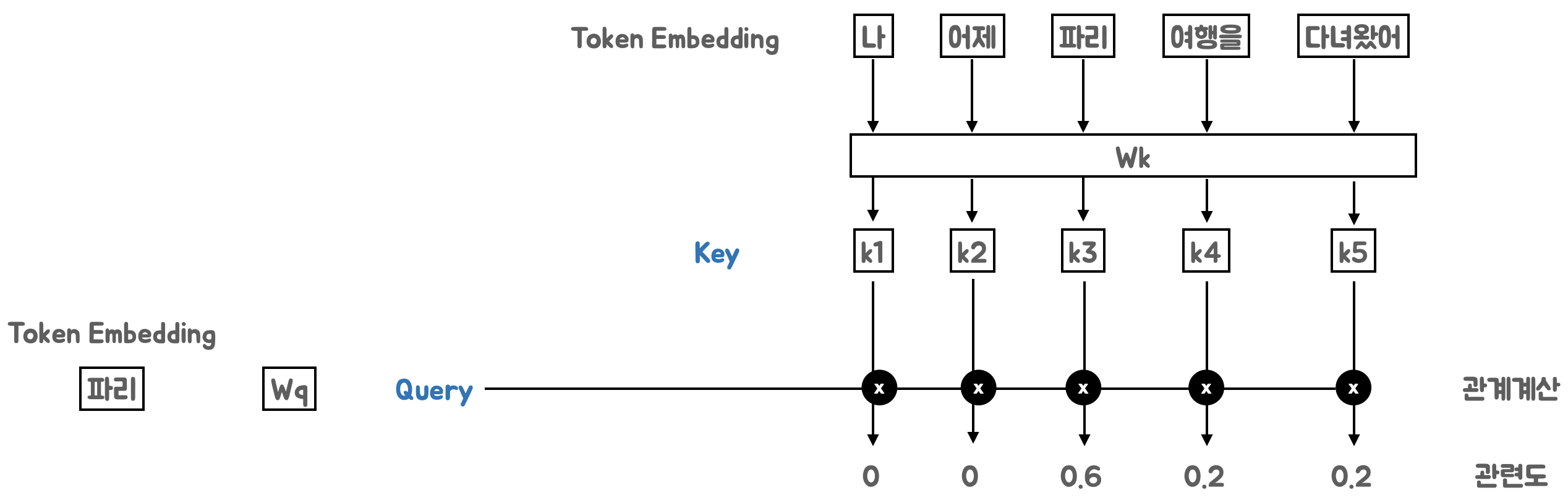 Query와 Key 토큰을 토큰 임베딩으로 변환해 관계를 계산하면 됨