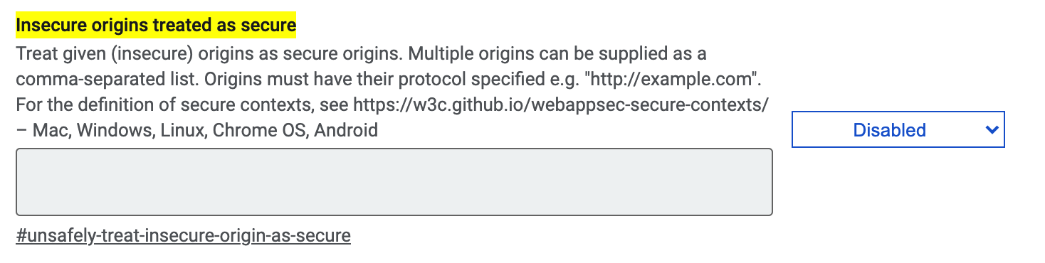 그러면 위와 같이 Insecure origins treated as secure라고 하는 항목이 보이는데 말그대로 secure하지 않는 것을 secure하게 해주는 부분이다.