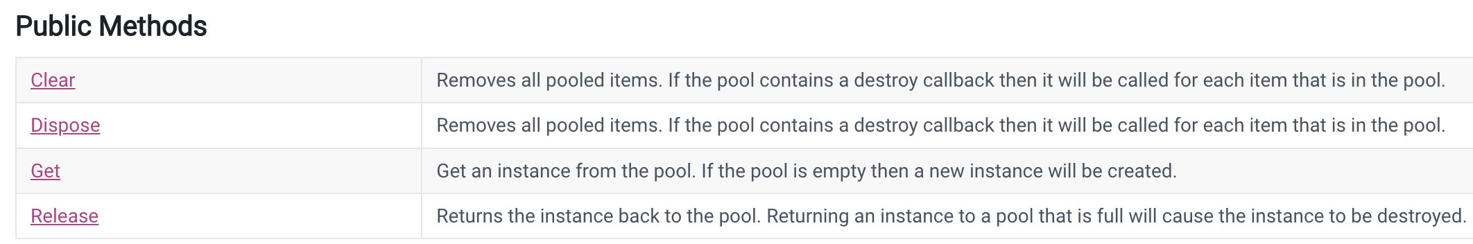 UnityEngine.Pool API는 Stack 기반의 object pool 패턴으로 object들을 tracking 해준다.