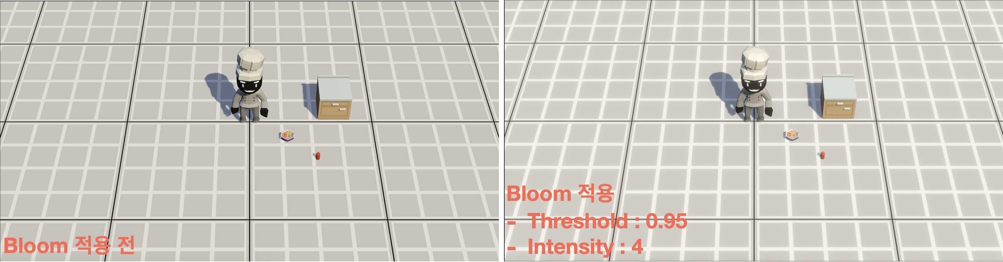 - Threshold : 해당 값보다 높은 밝기를 가진 픽셀에 효과를 적용, Threshold의 값이 낮을 수록 밝은 효과를 줌