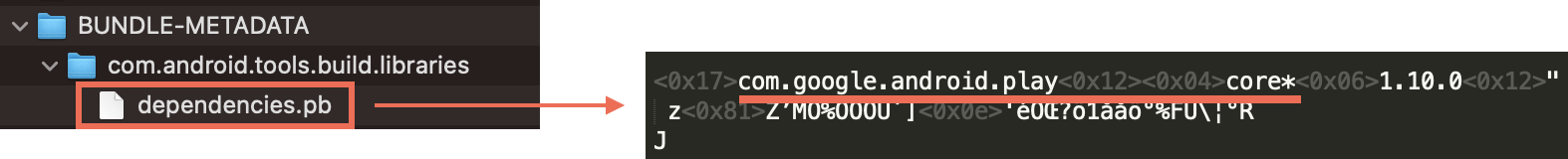 문제가 되는 앱의 aab 파일을 받아 압축을 풀어 dependencies.pb를 열어보니 play core 1.10.0이 들어간것으로 확인되었다