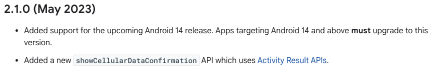 필자의 경우 Unity 2021.3.36f1으로 버전을 업데이트 했더니 해당 이슈는 더 이상 일어나지 않았고 Unity 2021.3.36f1은 Play Core가 아닌 Play Asset Delivery 2.1.0을 사용하는 것으로 보였다. Play Asset Delivery 2.1.0은 Android 14를 지원하는 버전이다